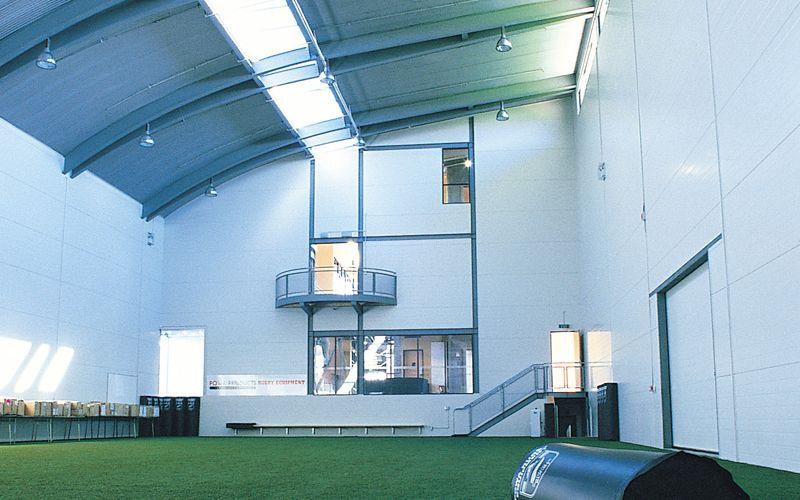 The entrance foyer offers views beyond to the playing fields, to the soaring void of the gymnasium alongside, and of the two floor levels above. The ground floor is 1.5 metres higher than the gymnasium to increase the available height in the gym, allowing direct access to and from the playing fields. The raised entrance level allows the changing and physiotherapy rooms to be housed in a semi-sunken basement with access from the accommodation, main building, playing fields and gymnasium. The main portion of the facilities building is structured according to function and level of privacy required, with flexible, ground floor teaching and dining rooms (the day-to-day functions), first floor weights room, management offices and boardroom and second floor management suites overlooking the fields.