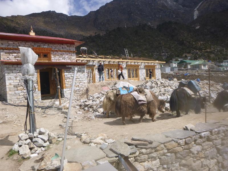 After 3 days trekking we arrived at Khunde Village, site of our project. 95% of the buildings here were destroyed by the earthquake, nearly all had been rebuilt in the ensuing 12 months, apart from the Community Hall. (Christchurch City Council, take note.) Helping to rebuild the hall was our project.