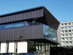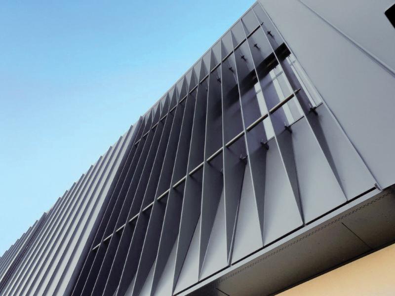 Because the Zinacore cladding was too difficult to facet in multiple directions, the feature walls on the first floor were clad in TARC TRAY Single Lock Standing Seam in Prefa P10 Black Aluminium.