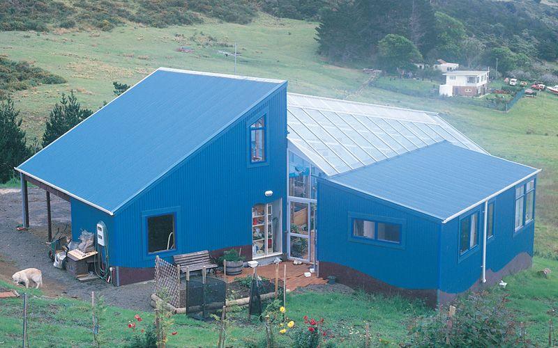 Nigel Cook usually clads the houses with corrugated metal which has been used, in New Zealand, for over a century. It is a product of modern technology that has been so widely used, for so long, that it is now a traditional vernacular. The recent refinements (use of Zincalume®) make corrugated iron a high quality and durable cladding. All the possible problems have been worked through providing a very stylish look to a house while remaining inexpensive.