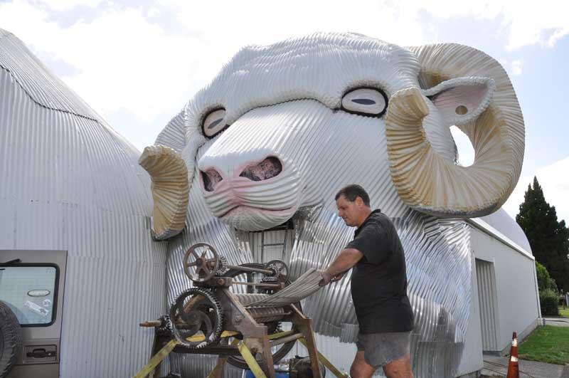 An addition earlier this year to Tirau’s compilation was a six metre high Ram’s head adjacent to the Tirau Sheep.  Originally commissioned by his brother and partner who were selling merino clothing in the building at the time, it had been a construction Steve thought would add to Tirau’s status.  “We bounced around a lot of ideas.  Originally they wanted a lamb – but how do you make a baby that needed to cover a building the same size as its ‘mother’?   It would’ve looked like two-headed GE sheep.  Then maybe a cow which would make a triptych.” Steve suggested a ram which he thought was the perfect solution – until he looked closely at a ram’s horn and realised how much work would be involved.  “It certainly wasn’t one of those jobs you do for profit,’ he said wryly.