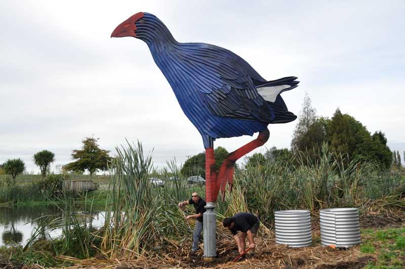 “The variety of our customer’s requests continuously amazes us – which is what keeps the job interesting”, said Steven.  “We have no desire to churn out hundreds of the same things – though we can never make enough small pukekos for the garden.  It is much more stimulating to build the largest pukeko in the world – and then try to erect it in a swamp in Otorohanga.  Or experiment with different things to make a string of pearls on a stiletto-wearing pukeko for a jewellery shop in Tirau.” (He ended up using painted ball floats.)