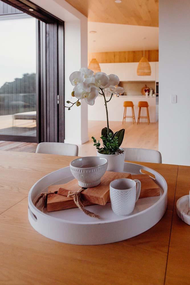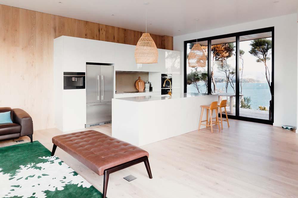When it came to the interiors, the couple wanted lots of storage and a simple layout and colour palette. The home has predominantly wooden floors in the main living areas with some wooden ceilings and walls. The bathrooms and bedrooms get more adventurous colour treatments. The kitchen’s glossy white cabinetry was made in China then shipped over here for assembly.