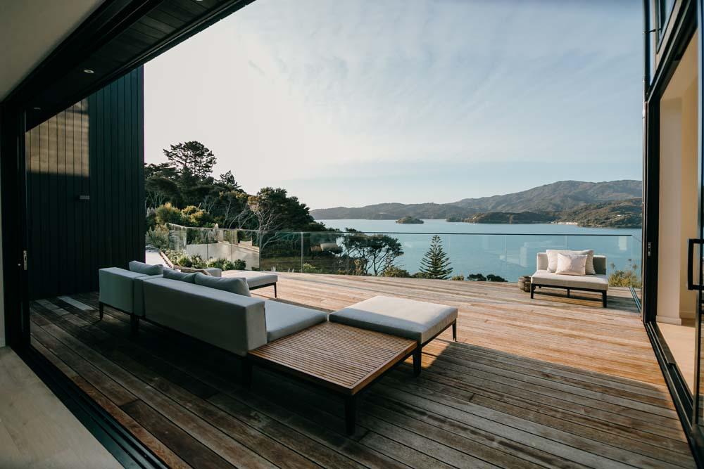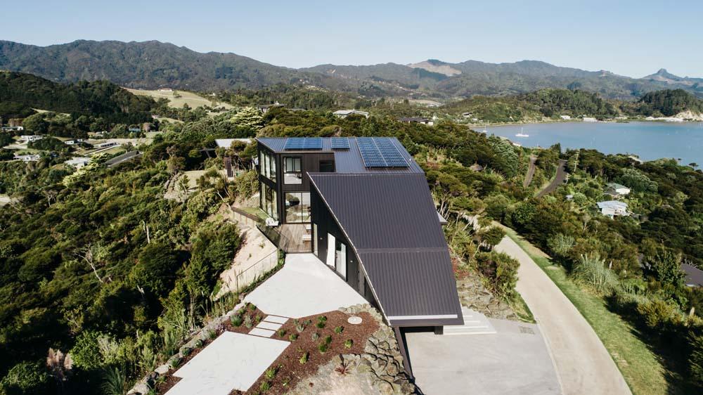 The spectacular site has views to one side of Coromandel Harbour and to the other side – looking northwest – of Long Bay. While providing great views, the site also presented challenges with its steep terrain.