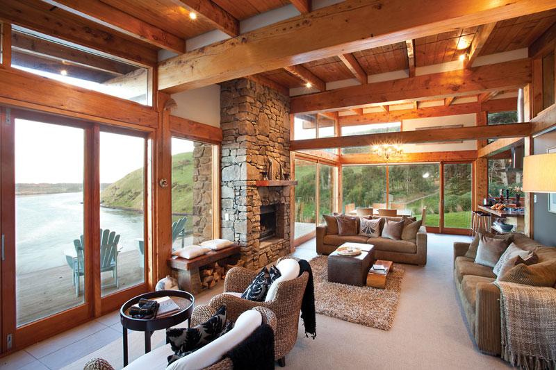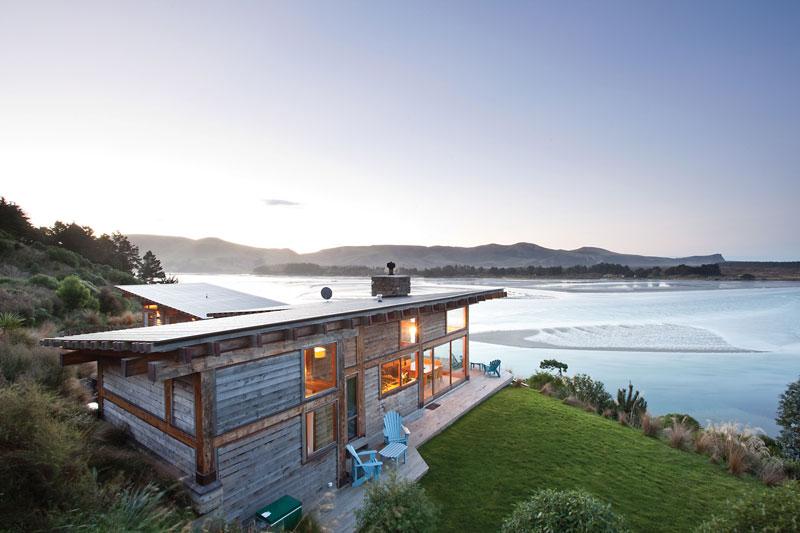 The lodge sits in five acres of coastal land overlooking the Papanui Inlet and affording panoramic views from every window – except these are more than just ordinary ‘windows’: much of the north-facing wall comprises in-fill panels of cladding and floor-to-ceiling glass, set within post-and-beam exposed construction from Macrocarpa timber harvested from the property.