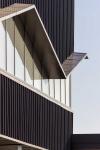 Outside the ground floor GP consulting rooms, angled precast concrete panels support the Level One overhang and allow in both natural light and views to the greenery outside – one of Ko’s prerequisites. Perforated metal screens provide additional privacy while admitting changing shadow patterns. The overhang itself is clad in Espan, broken by a continuous angled window which wraps around the corner of the building.