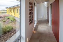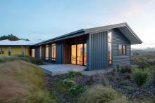 It sits on the crest of a hill, overlooking valleys with Mount Taranaki and the Kaitake Ranges in a direct line of sight and the Tasman Sea in the distance: Kowhai House, with its views in all directions, maximises the experience of the green hues of this undulating rural Taranaki site.