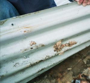 The small holes on the valleys of the profile were all pits but only at specific points. The points coincided with the cross-over of the wire netting – the point of contact where the wire netting had lost its galvanised protection and rusted away. The reason for the rusting of the wire was the salt laden air which had access to the underside of the sheeting because there were no baffle flashing to prevent it entering the ends of the corrugations.