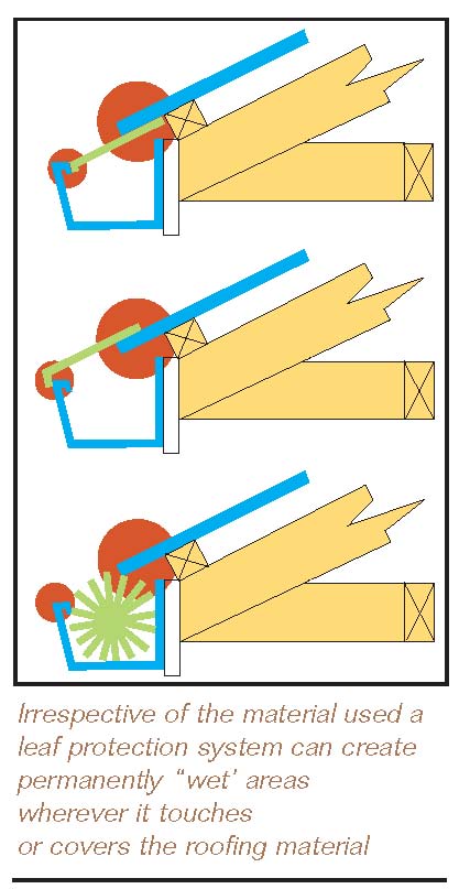 In recent years there have been a number of products launched onto the market which claim to prevent the blocking of gutter or spouting by leaves. There are two types - one which fits into the gutter, for example like a brush, and those which are attached to the bottom edge of the roof. This latter type is typically made of some sort of mesh or grid of plastic or metal, and there is even one made of slit and expanded Zincalume steel. Th