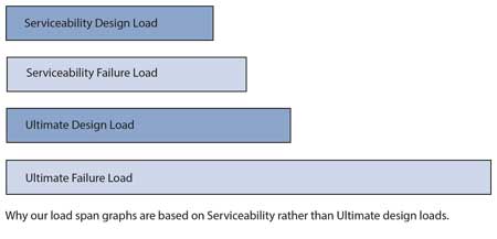 Why do we use serviceability loads? In building design, load calculations are made for ultimate design loads (when the roof would blow off) and serviceability design loads, (when the roof will permanently distort.)An ultimate design load is about 1 ½ times the serviceability design load. In testing we find that ultimate failure loads are about twice serviceability failure loads. Therefore if a pierce fastened profile passes a serviceability design load test for a particular design, it will easily exceed ultimate deign loads.