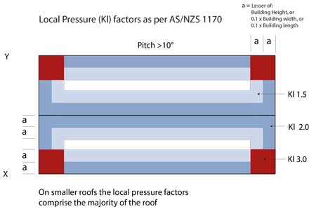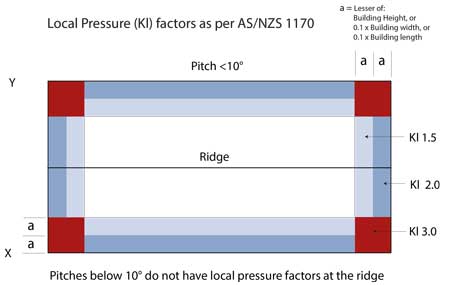 The COP addresses local pressure factors by saying to reduce end spans by 1/3rd. This isn’t correct, local pressure areas take up large areas of an average house roof. Fortunately NZS 3604 simplifies this by applying a factor of 1.5 over the entire roof.