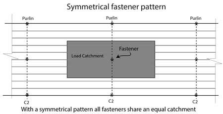 When a symmetrically fastened sheet is under uplift load, the unfastened crests bow upwards for the entire length of the sheet, the pressure being shared by the adjacent crests’ fasteners. Put a fastener into that otherwise unrestrained crest, and that fastener will be trying to resist uplift of that crest for the entire length of the sheet.