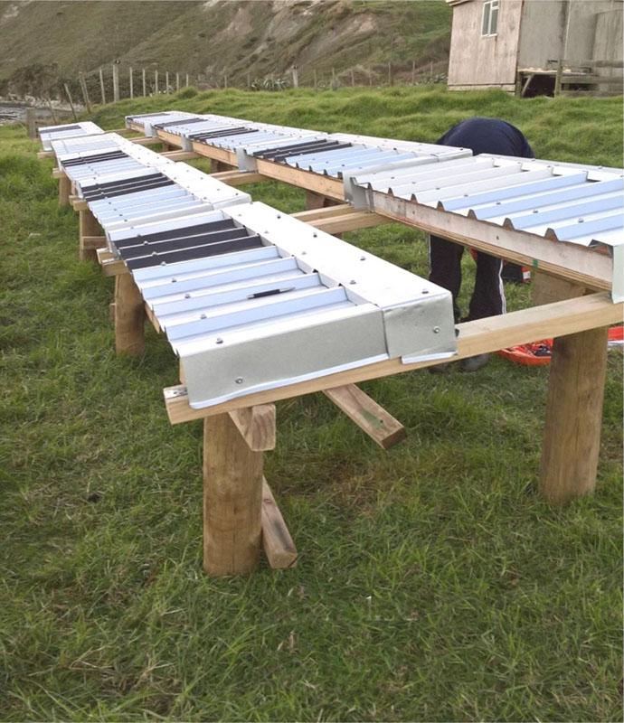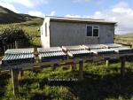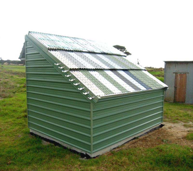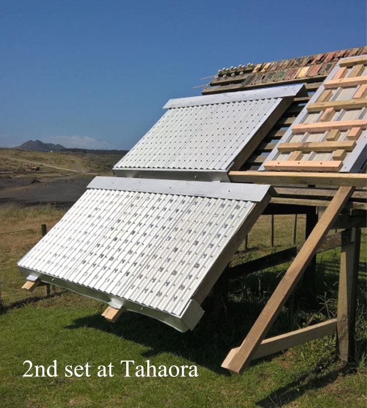 First two rows were fully exposed and the top row covered with clear sheet so that air (salty, damp, or whatever) could enter but no rain-washing was possible. A shed was used as a persisting gift to the sites used, which were (north to south) Waipu Golf club (east); Muriwai Golf Club and Taharoa ironsand mine (west); Nelson boulder bank (north facing) and Invercargill Clay Target club (south facing). All these within 1-200 m from the sea, but with differing wind directions. These sites were assessed using both the methods in ISO 9223 etc, by exposing metal coupons and assessing metal weight losses annually and to a limit set by the standard, and also by measuring the corrosivity of the atmosphere over time intervals by using a salt candle to assess the actual salt content of the air, analysed monthly by local laboratories, and by recording the humidity and temperature at 5 hour intervals and analysing the data at 6 month intervals. Based on the ISO standard set these measurements were supposed to reveal the relative and absolute corrosion levels of the sites. We also examined the actual roofs and screws at regular intervals.