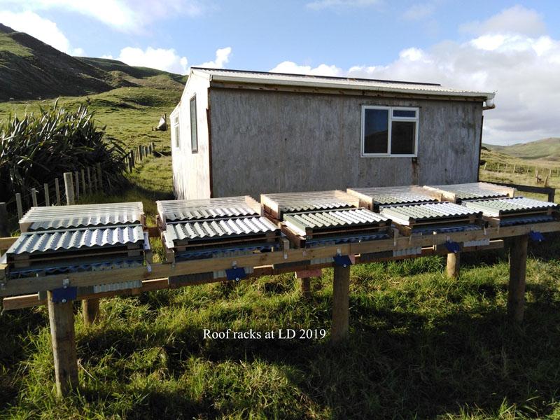 We then offered our site for testing to our regular supporter screw suppliers and ended up with five takers. In 2019 we installed test panels of painted and unpainted roof and screws in four configurations – fully exposed; partly covered with clear sheet; partly washed (mounted vertically under the fully exposed panels, and upside down again under the exposed panels.