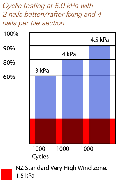 Having established the upper limits of static testing the roof was then subjected to cyclic testing with pulses of pressure every 2 seconds. The tests started with 1000 cycles at 60% of the static load and then increased to 1000 cycles each at 80% and 90%.. The single nail batten/rafter tests were at 2.9 kPa and the normal two nails batten to rafter tests were at 5.0 kPa, well above the New Zealand standard configuration to fixing. In both instances of cyclic testing failure at the batten junction occurred when the pressure reached 90%. This figure, 4.5 kPa, established the acceptable design load. ( Graph below). The standard 4 nail tile to batten fixing showed no sign of failure.