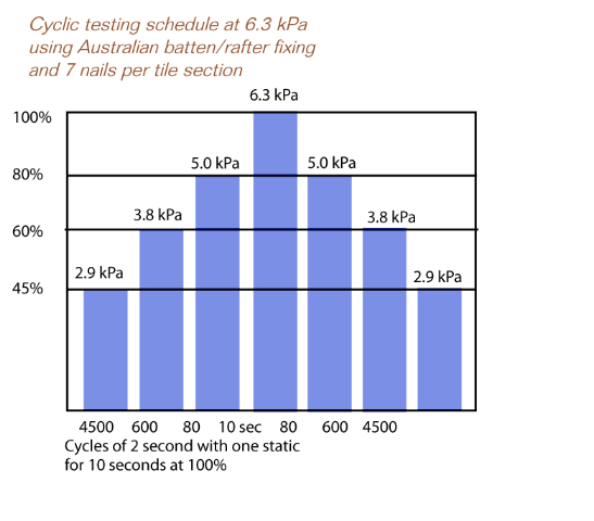 Cyclic testing schedule at 6.3 kPa using Australian batten/rafter fixing and 7 nails per tile section