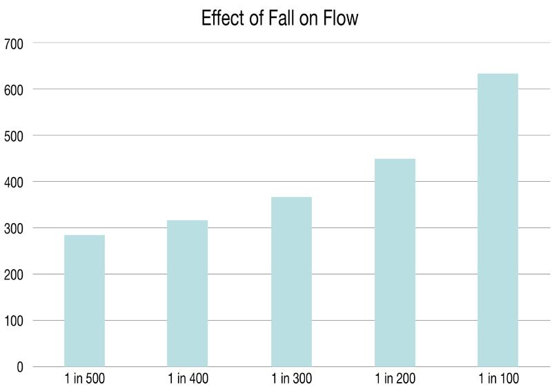 The problems do not end there. By working solely off the roof plan area, E1/AS1 makes no provision for water coming off an adjacent wall, which can have a significant effect on catchment area. It also has no minimum fall for gutters, which in turn can affect water flow by over 100%